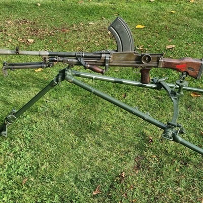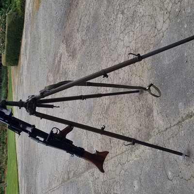 All steel construction folding tripod for use with all models of the WW2 Bren Gun. Manufacture stamped CCM for the Canadian Cycle & Motor Company Ltd. Painted in the standard Canadian arsenal green, with most of this paint remaining. A very good condition field used WW2 Canadian item. All wing nuts are functional, and it sets up and collapses correctly. The T&E …