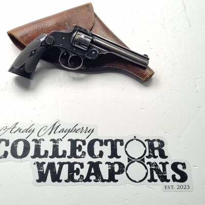 A nice little 7 shot, top break, double action, "Target Style" revolver in 22 caliber by Harrington & Richardson. It has the rare, 2 screw, hard rubber, extended target style grip that is in excellent condition with no chips or cracks. The revolver retains most of the original factory blue finish with some minor freckling. All markings are sharp and clear, matching numbers. In its little leather …