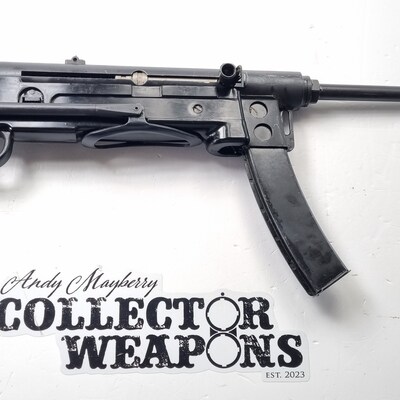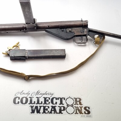 This is an original Sten Mk III submachine gun from WW2. A further simplification of the STEN design, the Mark III uses a one-piece receiver/shroud assembly, non-detachable barrel, and a fixed position riveted magazine well. While lighter and simpler, the Mark III was harder to repair; damage that would temporarily sideline a Mark II could be fatal to a Mark III. Production was discontinued in 1…