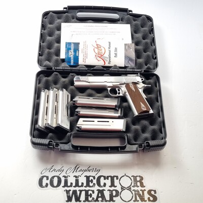 This Kimber 1911 Gold Match II 9MM pistol has a highly polished stainless steel finish with rosewood, hand-checkered, double diamond grips. It features an adjustable target sight with steel-on-steel click adjustments, stainless steel match grade barrels that are hand fit for accuracy, and a match grade premium aluminum trigger that breaks clean at 4-5 pounds.
