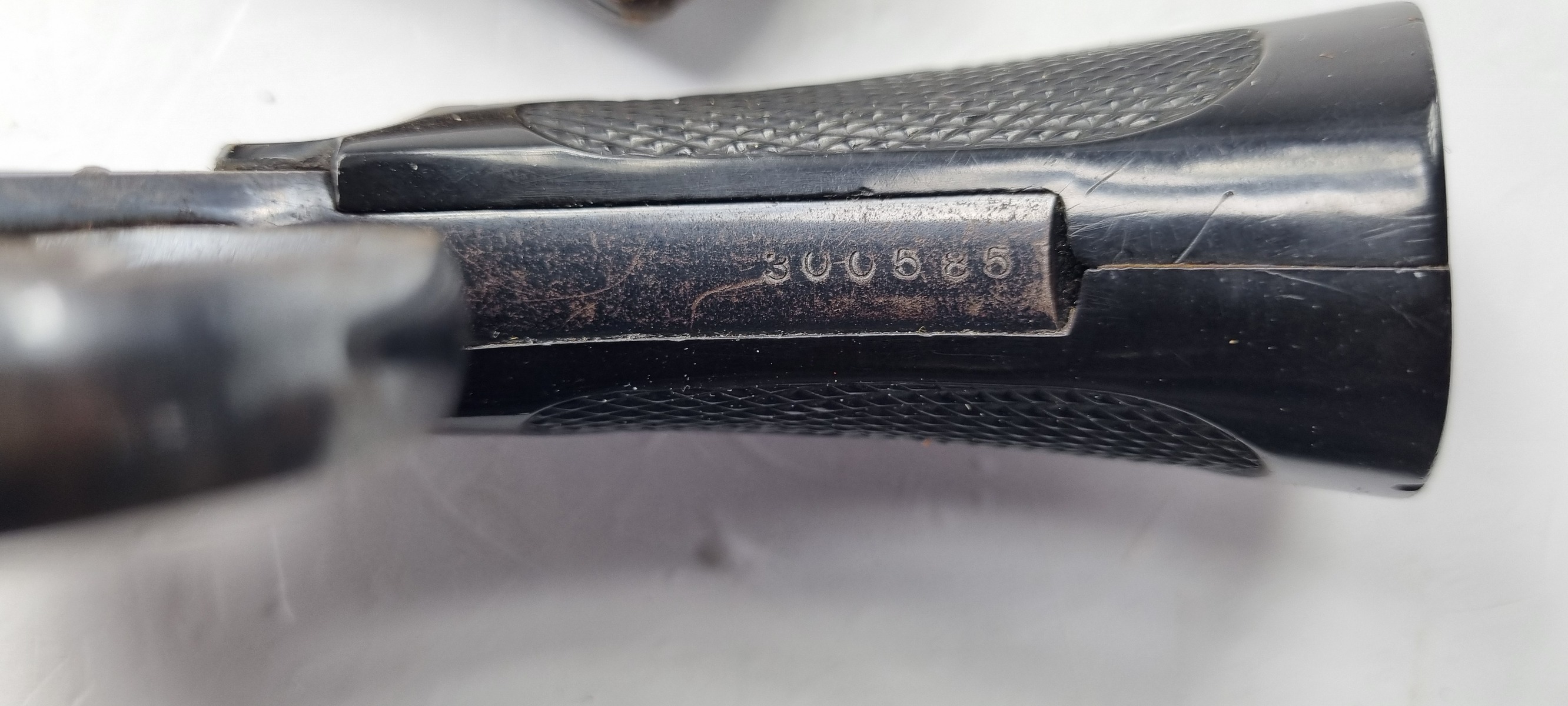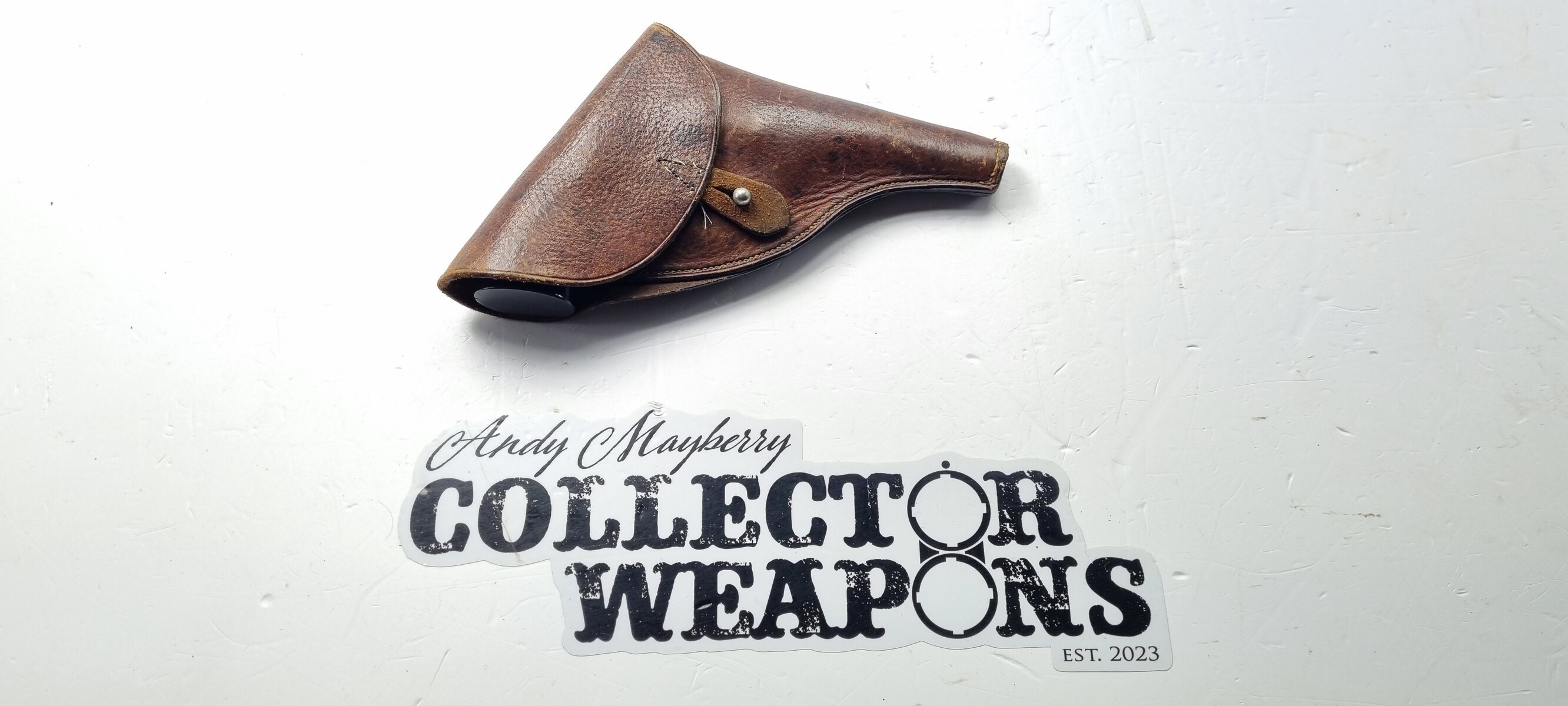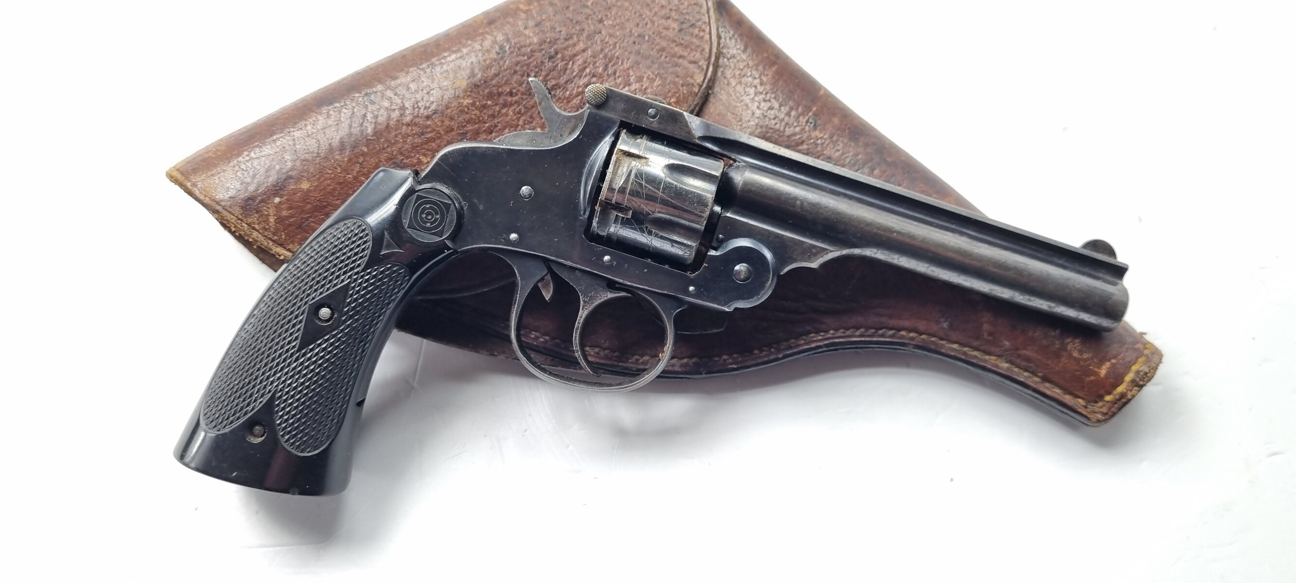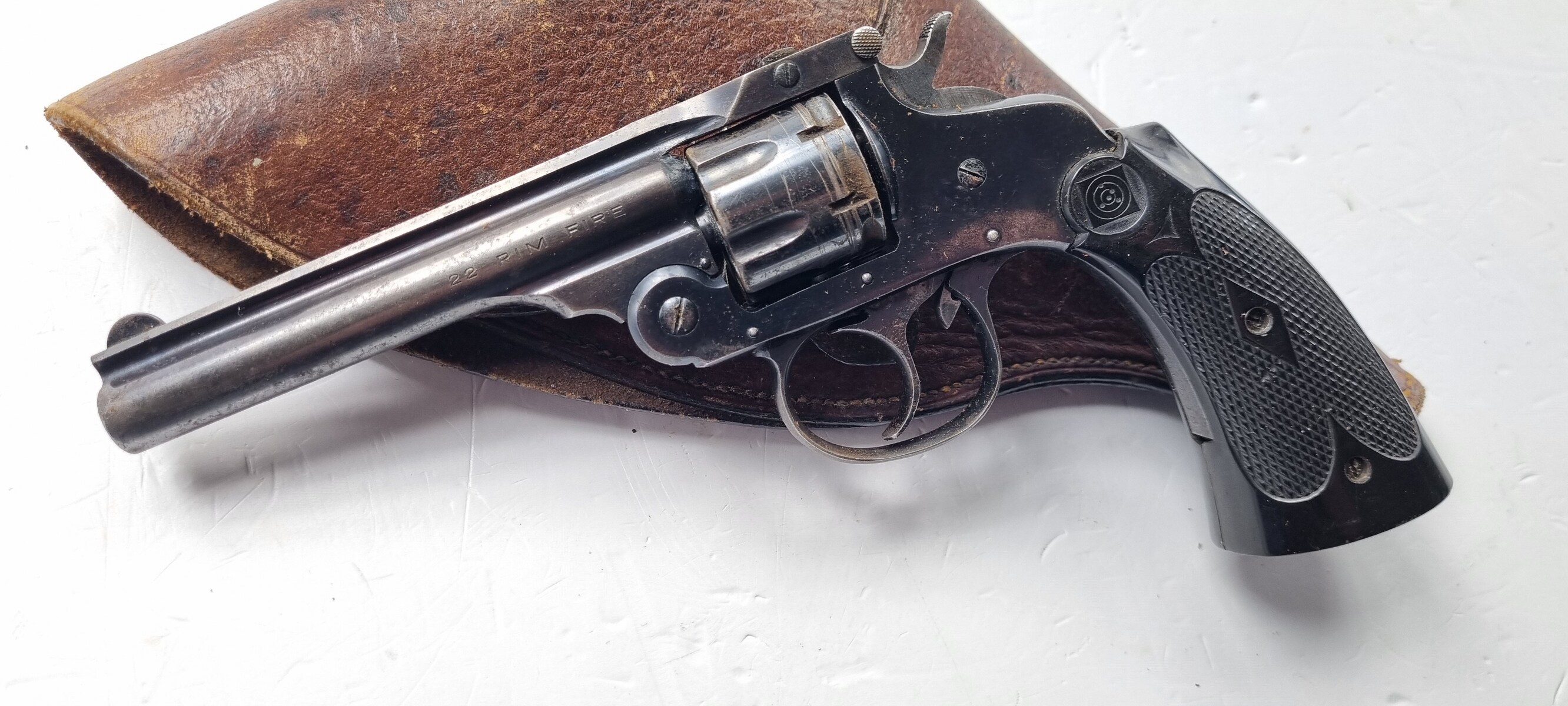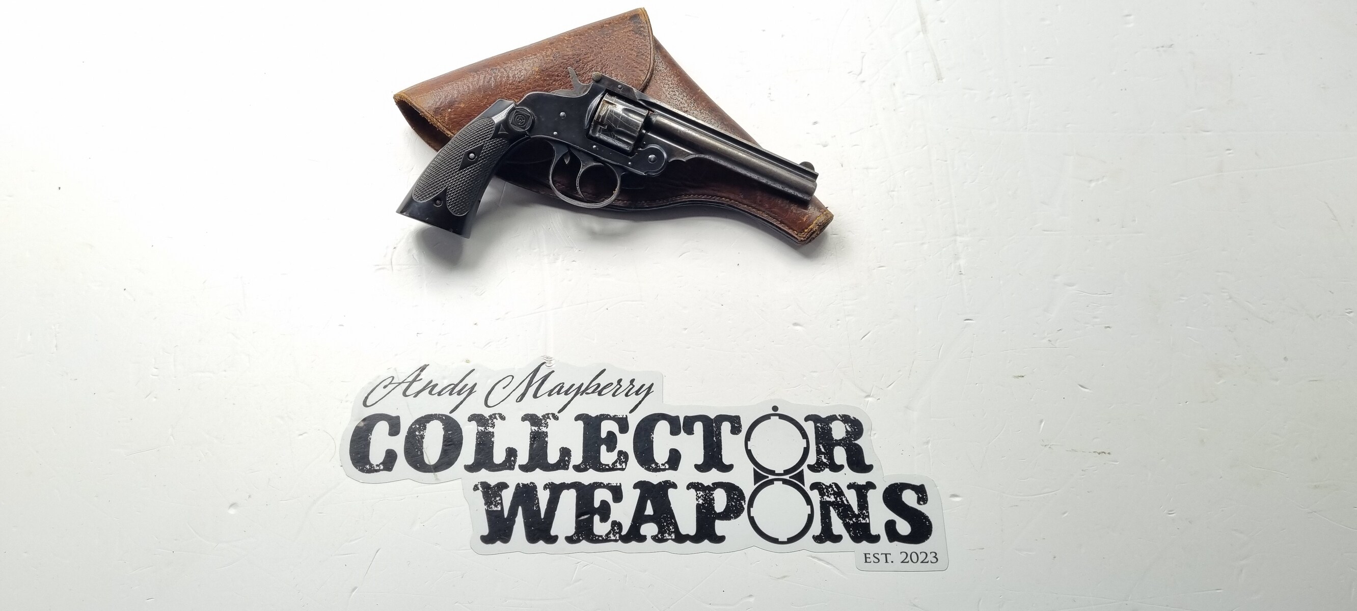 A nice little 7 shot, top break, double action, "Target Style" revolver in 22 caliber by Harrington & Richardson. It has the rare, 2 screw, hard rubber, extended target style grip that is in excellent condition with no chips or cracks. The revolver retains most of the original factory blue finish with some minor freckling. All markings are sharp and clear, matching numbers. In its little leather holster.