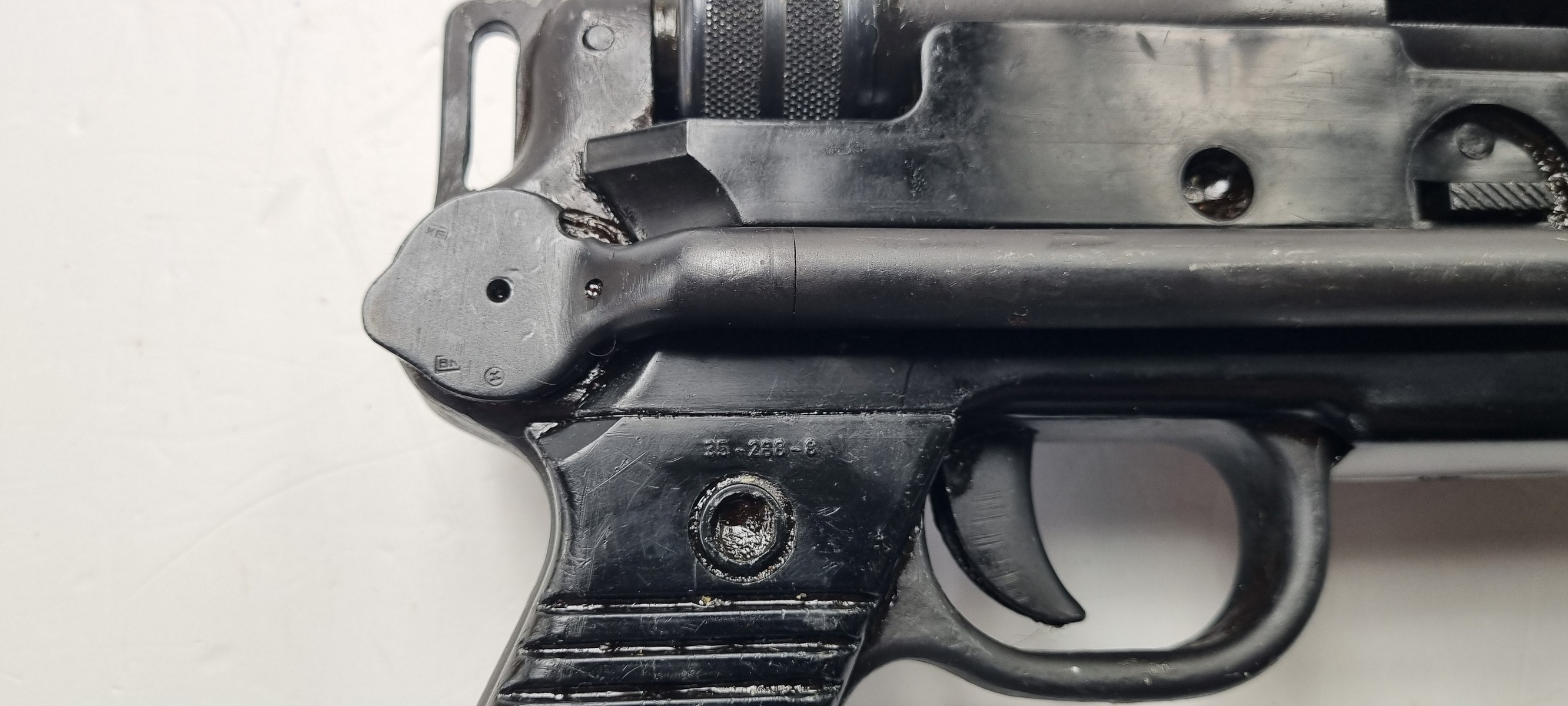 The M56 borrowed heavily in terms of ergonomics from the MP40, however, the mechanical similarities are minimal. The M56 does not use the MP40′s telescoping recoil spring. The bolt and receiver were instead copied from the Beretta Modelo 38/44. As such the M56 was a simple blowback weapon, it continued to use the earlier M49′s 7.62x25mm chambering. The M56′s curved box magazine is proprietary and not interchangeable with the M49/PPSh’s 35-round magazine , though similar to the PPS’s magazine.