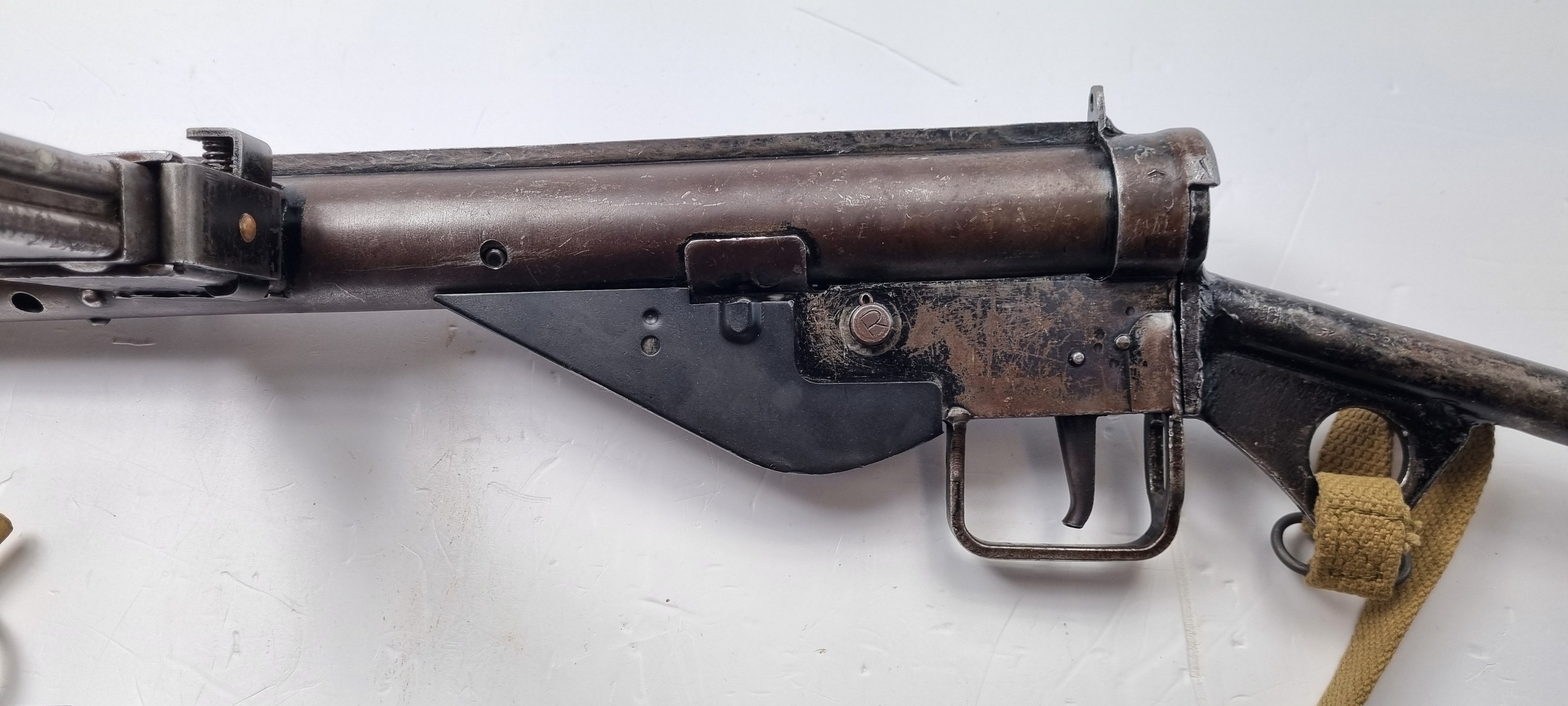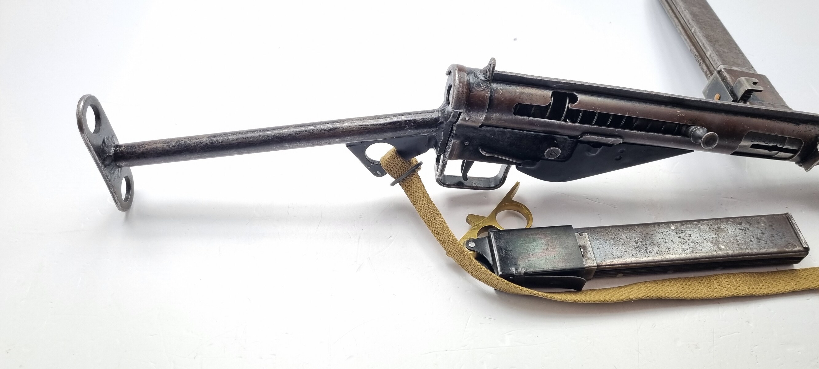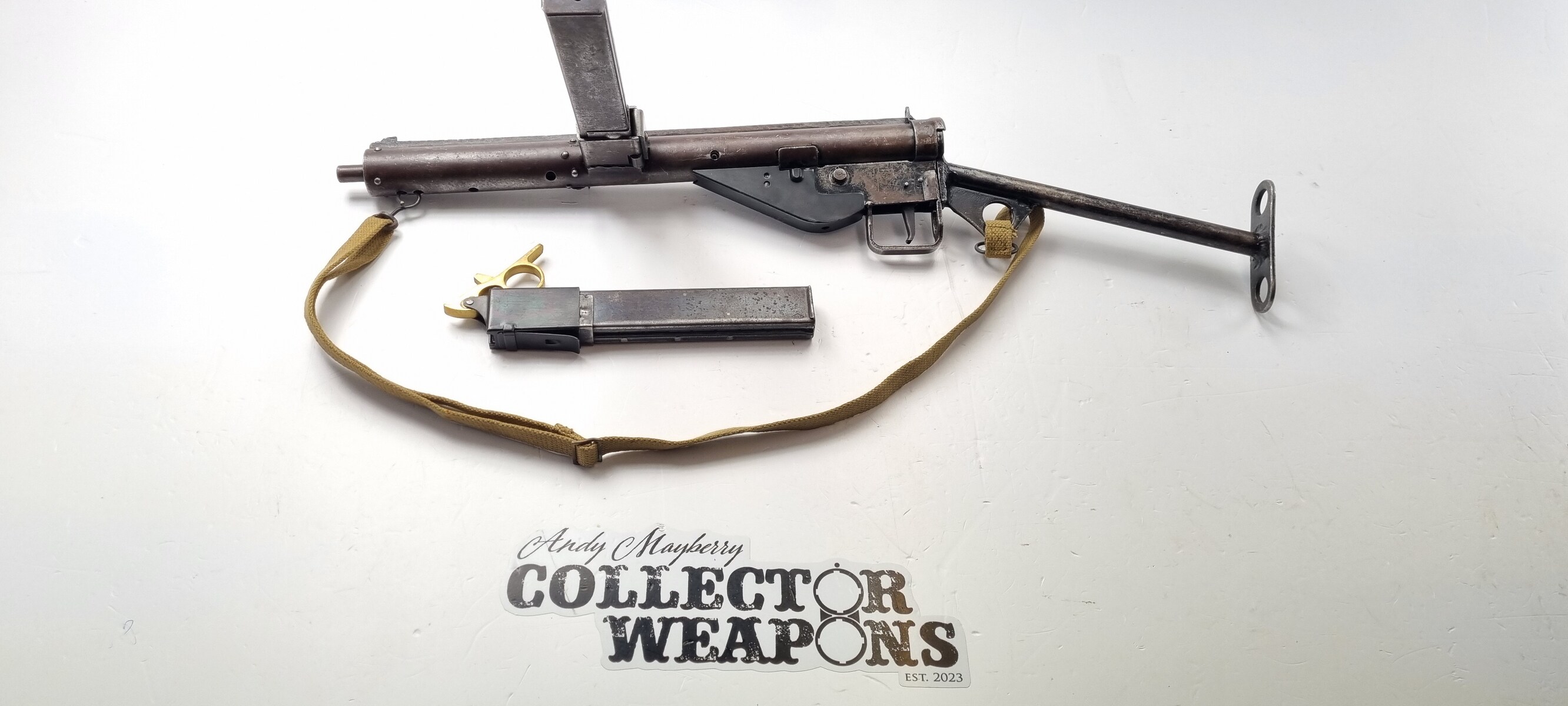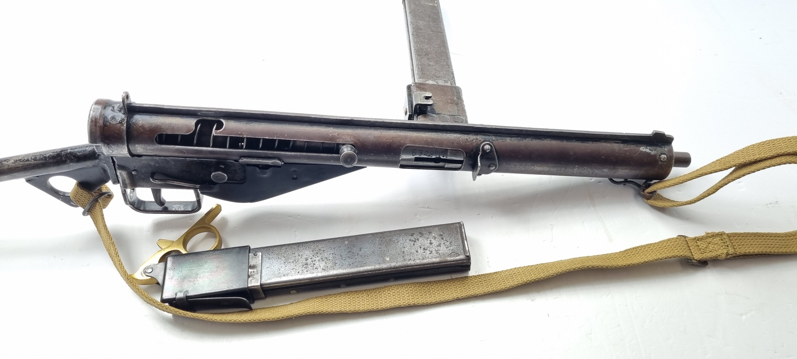 This is an original Sten Mk III submachine gun from WW2. A further simplification of the STEN design, the Mark III uses a one-piece receiver/shroud assembly, non-detachable barrel, and a fixed position riveted magazine well. While lighter and simpler, the Mark III was harder to repair; damage that would temporarily sideline a Mark II could be fatal to a Mark III. Production was discontinued in 1943. Blade front and peep rear sights on the integral receiver rib, with STEN M.C MkIII on the magazine well. The finish is thinning on the receiver. Strong, shiny bore. Comes with Two Magazines and Magazine Loading Tool & Sling.