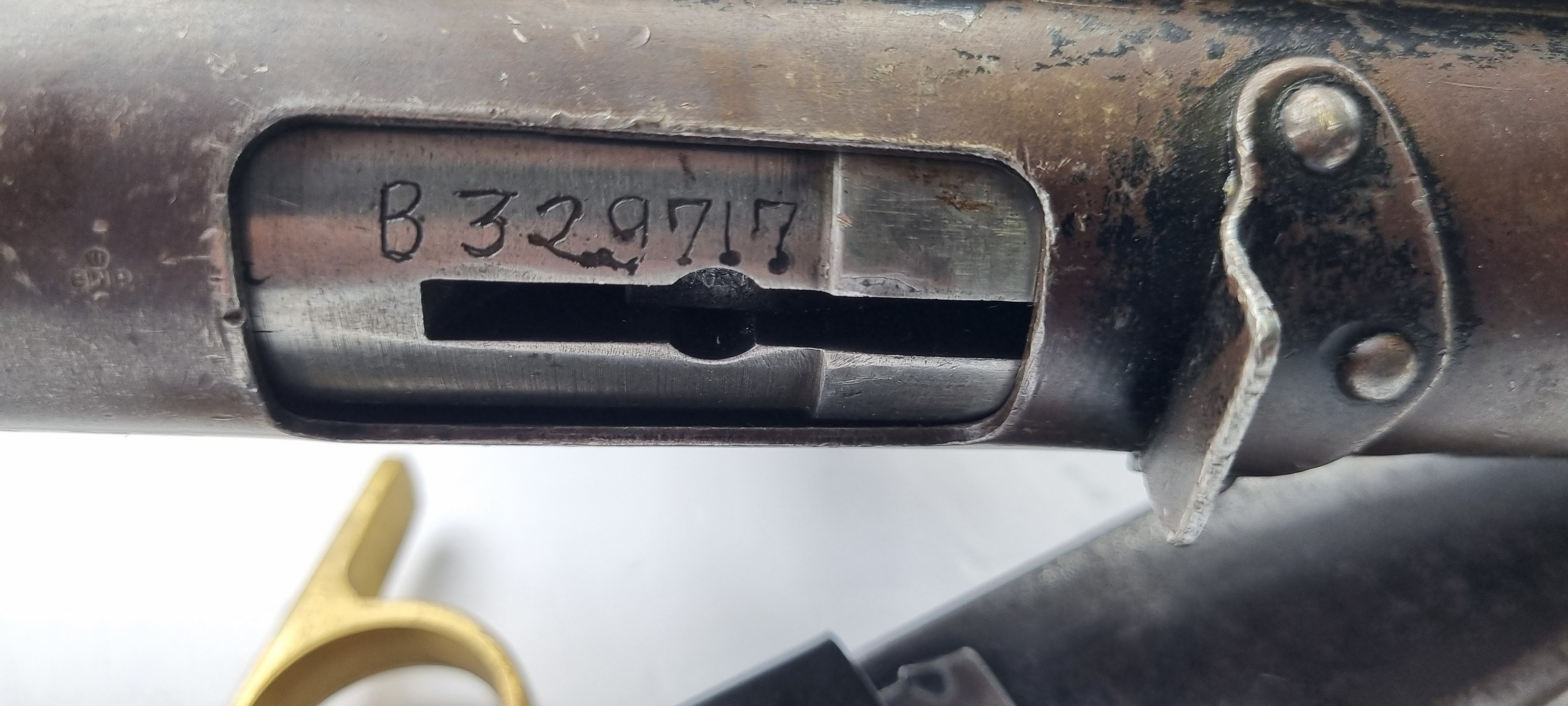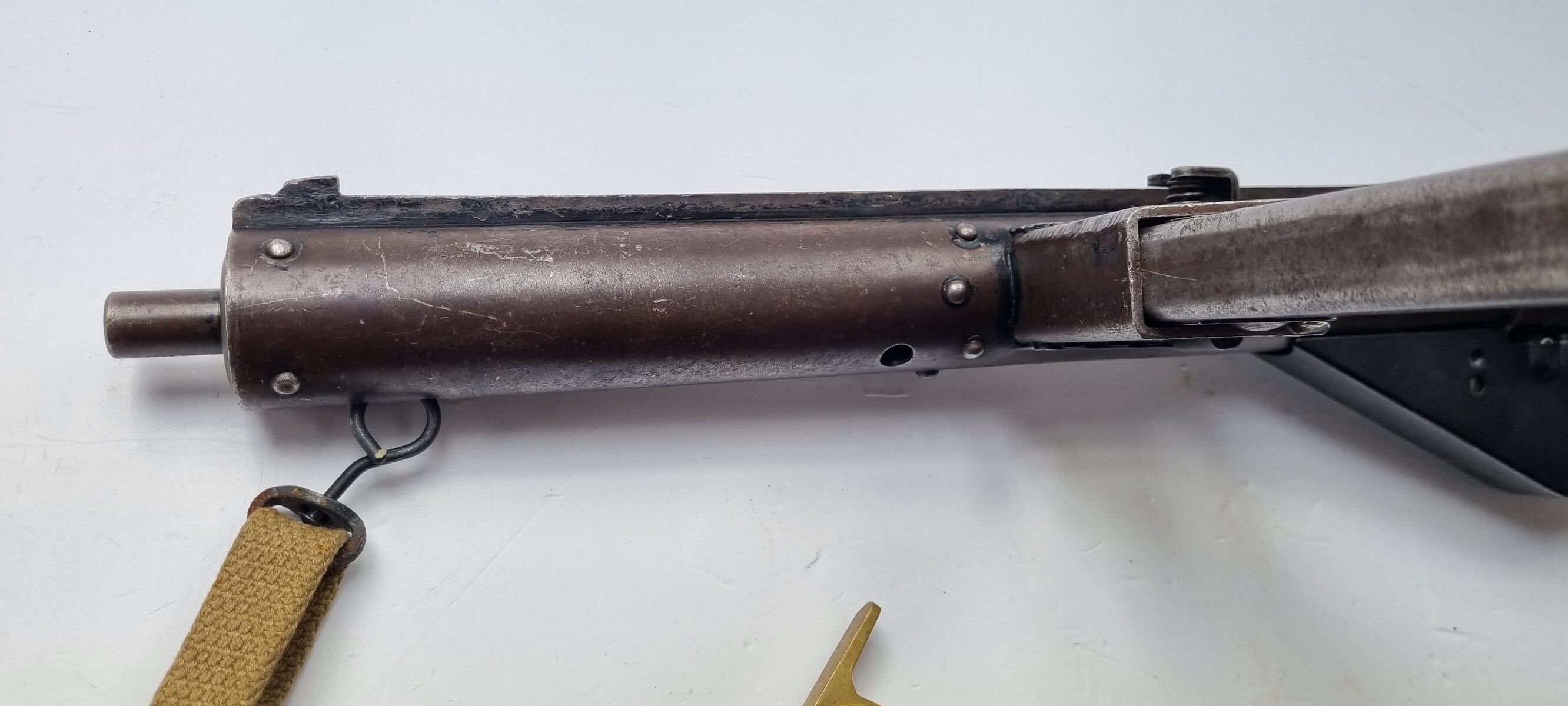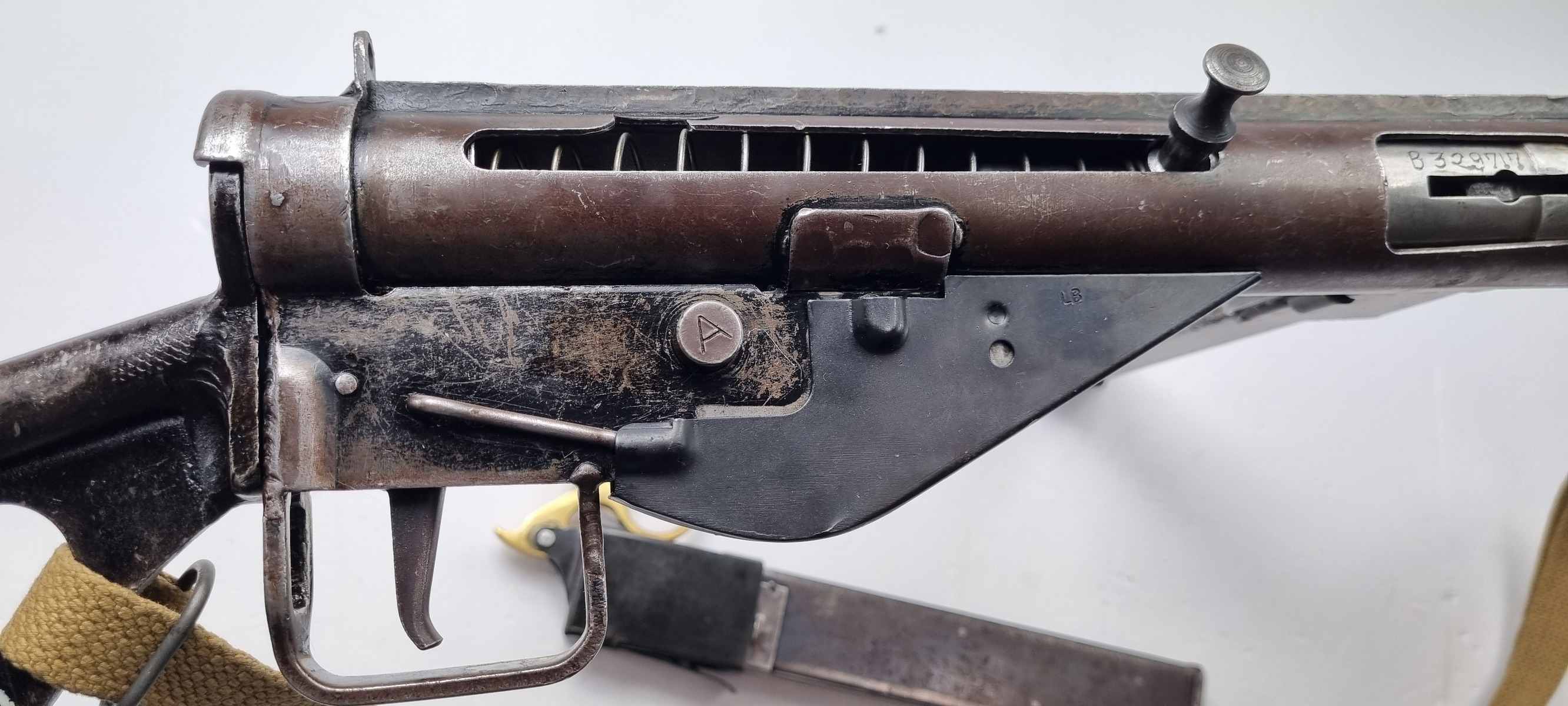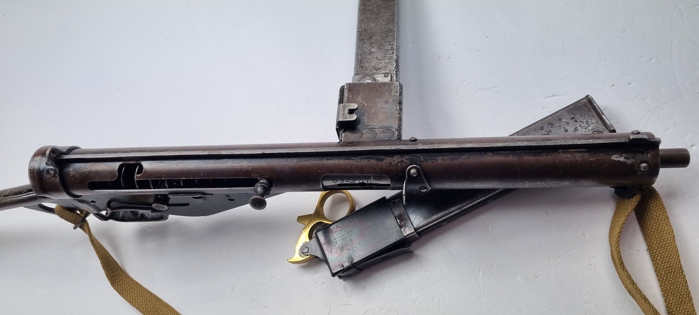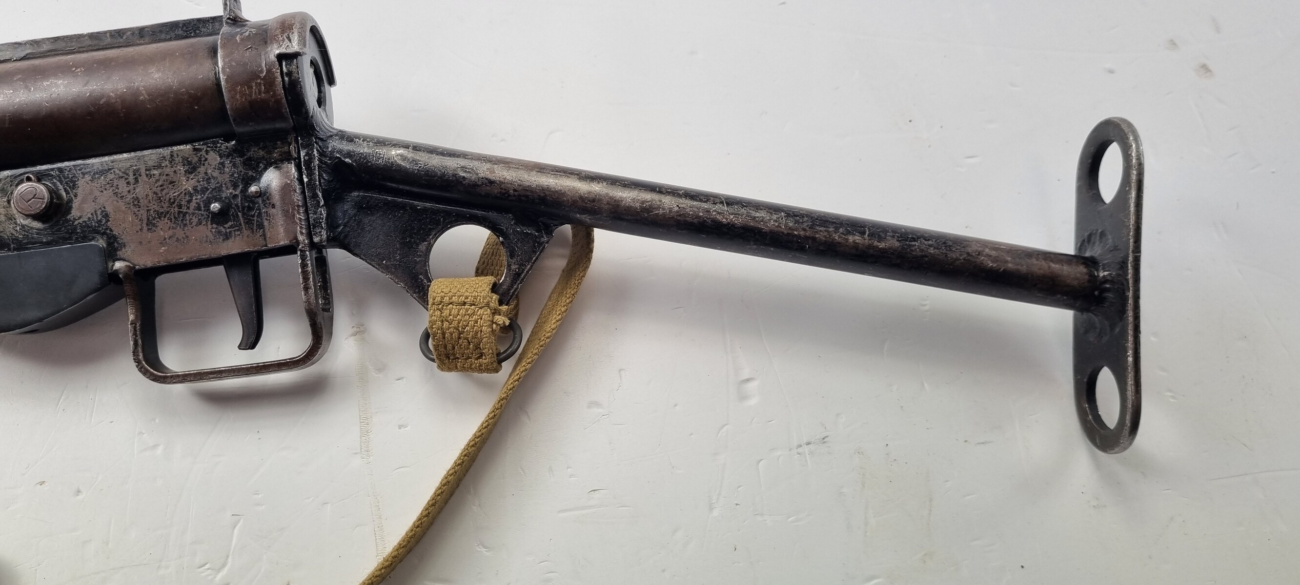 This is an original Sten Mk III submachine gun from WW2. A further simplification of the STEN design, the Mark III uses a one-piece receiver/shroud assembly, non-detachable barrel, and a fixed position riveted magazine well. While lighter and simpler, the Mark III was harder to repair; damage that would temporarily sideline a Mark II could be fatal to a Mark III. Production was discontinued in 1943. Blade front and peep rear sights on the integral receiver rib, with STEN M.C MkIII on the magazine well. The finish is thinning on the receiver. Strong, shiny bore. Comes with Two Magazines and Magazine Loading Tool & Sling.