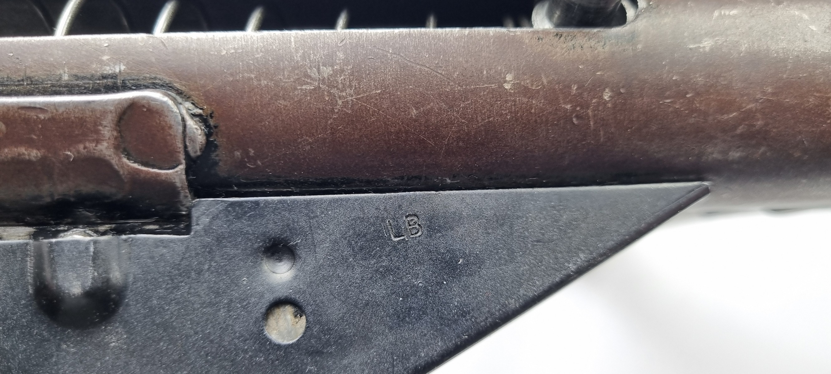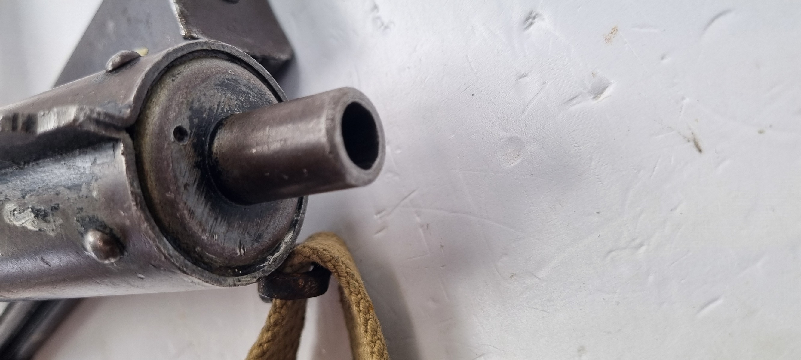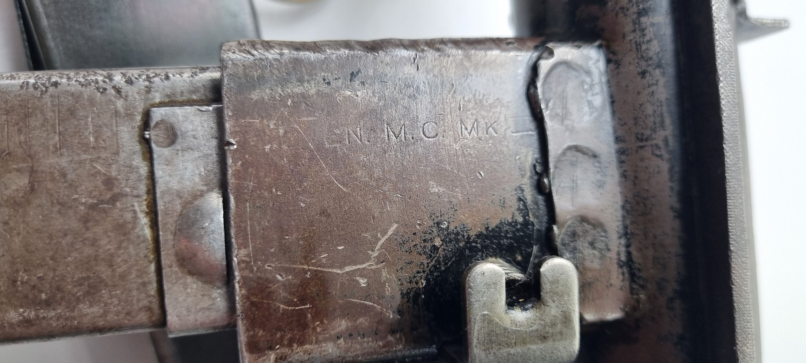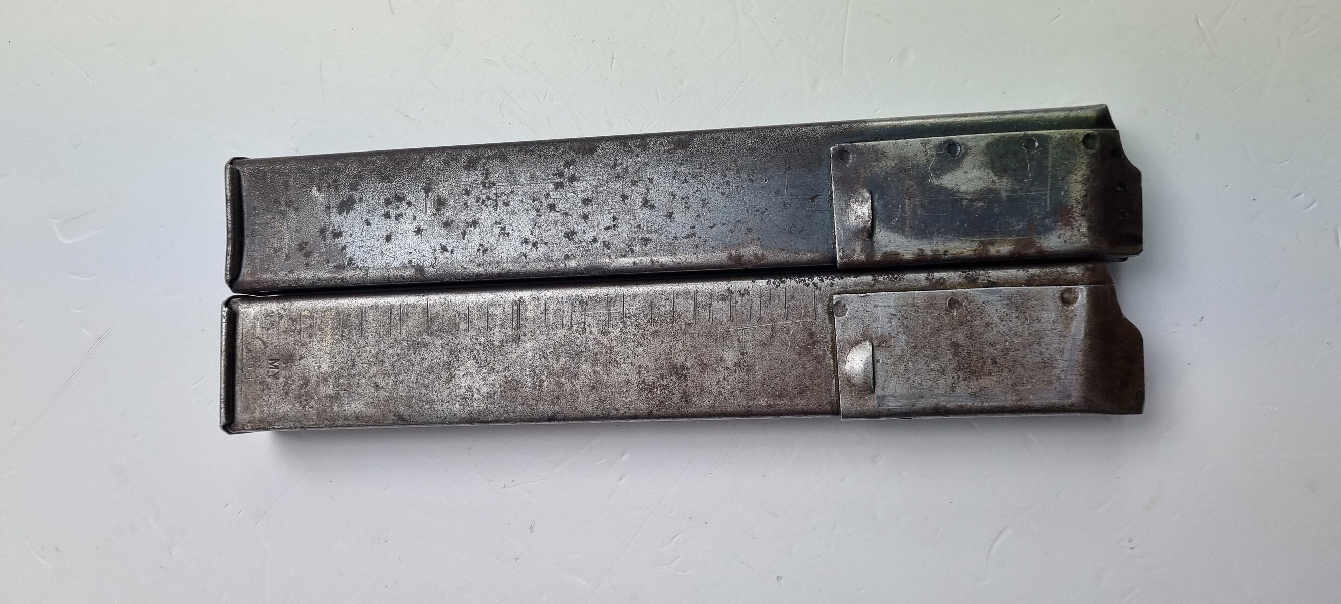 This is an original Sten Mk III submachine gun from WW2. A further simplification of the STEN design, the Mark III uses a one-piece receiver/shroud assembly, non-detachable barrel, and a fixed position riveted magazine well. While lighter and simpler, the Mark III was harder to repair; damage that would temporarily sideline a Mark II could be fatal to a Mark III. Production was discontinued in 1943. Blade front and peep rear sights on the integral receiver rib, with STEN M.C MkIII on the magazine well. The finish is thinning on the receiver. Strong, shiny bore. Comes with Two Magazines and Magazine Loading Tool & Sling.