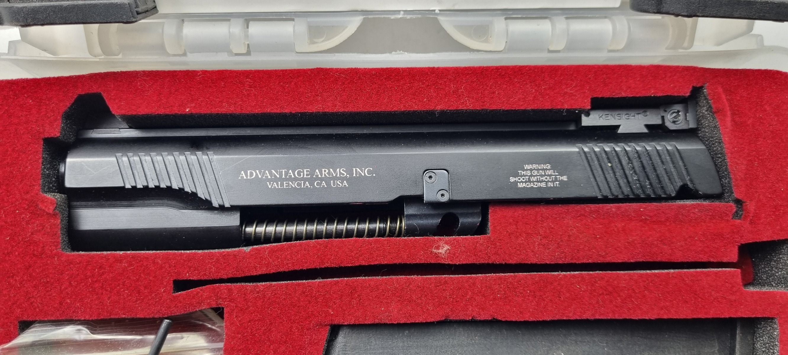 The slide will lock open after the last round in the magazine has been fired. Our unique magazine design and patented heat-treated steel lock open insert allows us to offer this special and desirable feature which you can only find on 'Advantage Arms' .22LRconversion kits.