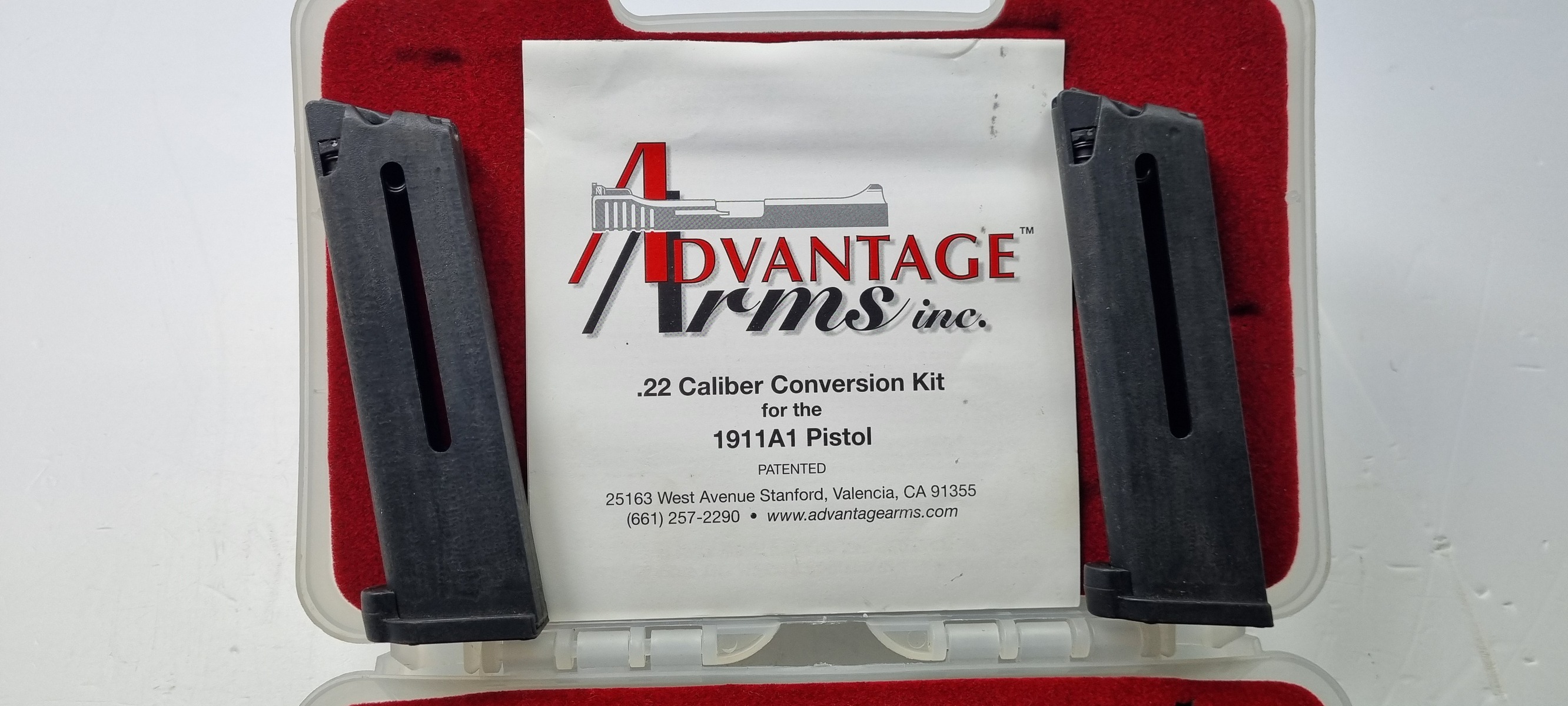 Installation is simple and does not require any modifications to your 1911 pistol. Simply remove the 1911 magazine and slide as outlined in your 1911 owner's manual. Now slide the "Advantage Arms" slide onto the frame, insert the slide stop pin and tighten guide rod. Insert the conversion magazine. You are now ready to shoot. This procedure can be accomplished in less than 30 seconds with some practice.